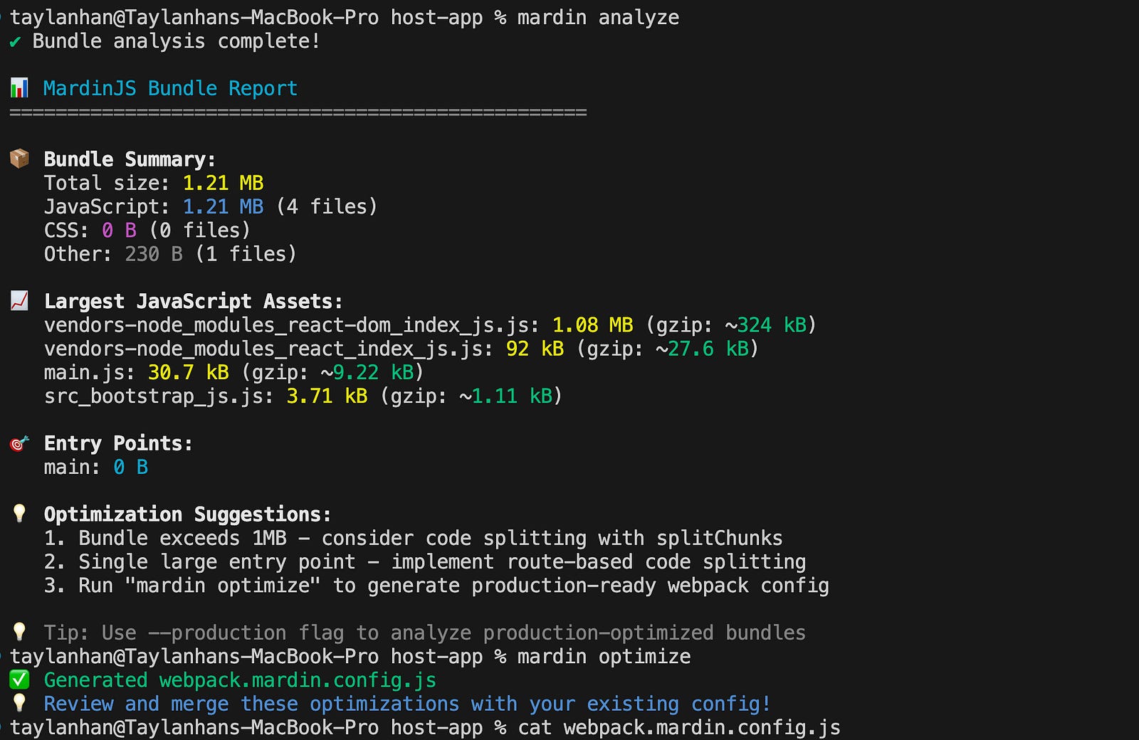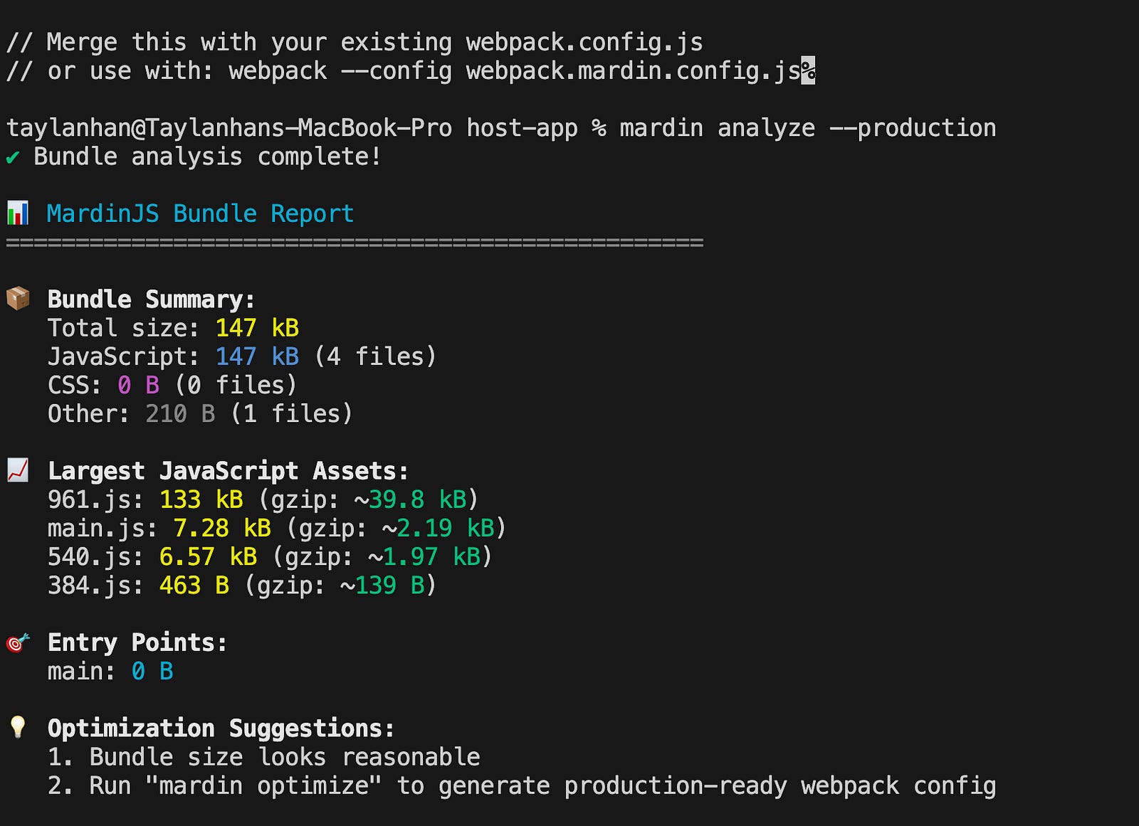 npx mardinjs optimizeThis generates a `webpack.mardin.config.js` with production-ready optimizations: