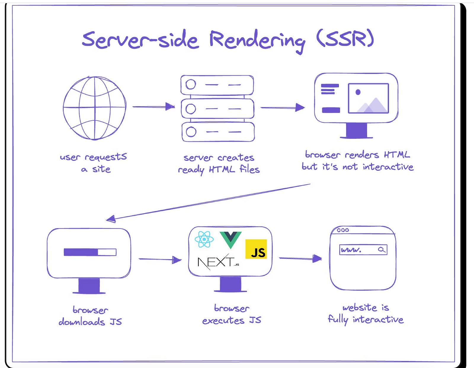 Basically, SSR is a method where the server generates the HTML and CSS code for a web page and sends it to the client (the user’s browser) as a fully rendered page.